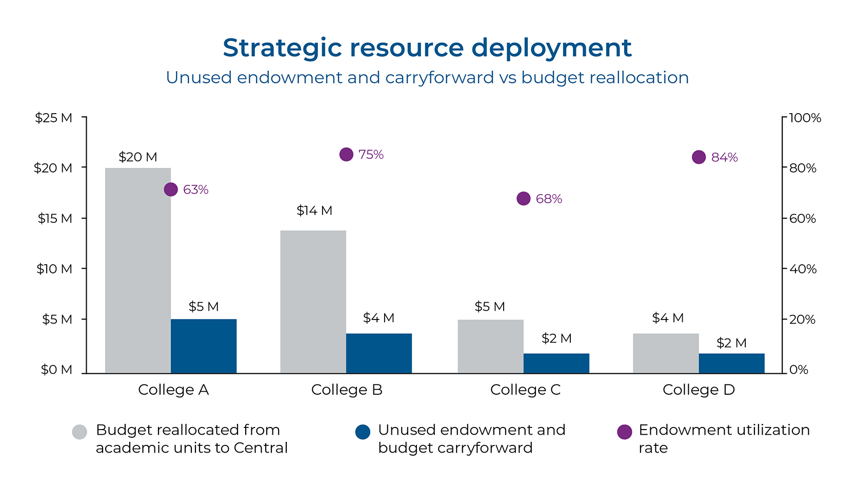 Institutions often underutilize restricted and internally committed balances. Traditional budgeting practices may not account for the dynamic needs of an academic institution, resulting in some funds remaining untapped. As a result, significant amounts of money may sit idle instead of being used to address pressing financial challenges or invested in growth opportunities. To alleviate immediate financial pressures, institutions should first assess the use of fund balances with an all-funds perspective.